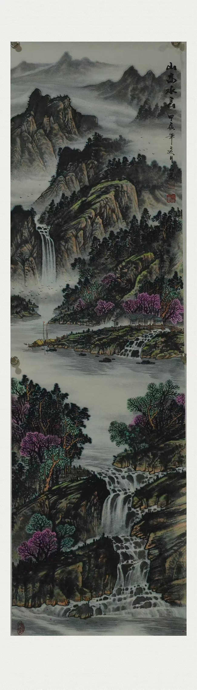 草木是泼洒开的绿,从山脚的针阔混交林,到山腰的岳桦林,再到近山顶的高山苔原,一层叠着一层,深绿、浅绿、黄绿,揉在一起却不杂乱。溪水该是藏在林间的,他不画整条溪流,只画溪岸碎石上凝着的水汽,画溪边岳桦的枝干斜着探向水面,连叶子上的露珠都像能滴下来。最妙的是雾——他以淡墨晕染,不似厚重的白,反倒带着点蓝的灰,缠在山尖上,绕在树林间,把远处的峰峦遮得只剩个模糊的轮廓。站在画前,仿佛能听见林间的鸟鸣,能闻见松针的清香,连风都带着湿润的凉意——这该是长白山最热闹的时节,却因这层雾,添了几分说不尽的神秘。